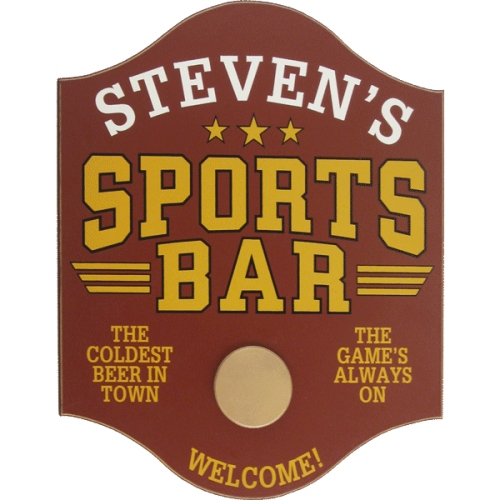 This great Hockey Sports Bar sign comes ready to hang and is made of real wood with a birch veneer finish. It is highlighted by a 1" poplar wood frame with a routered edge and hand painted gilded pinstripes. Sign measures 18" x 14" and features a keyhole in back for easy hanging. The hand rubbed stain on our exclusive Hockey Sports Bar sign adds a slightly aged look. The personalized Silkscreened text is accented by hand. Includes a 3D resin hockey puck in center. Our sign is handcrafted and 100% Made in the USA. Made of real wood. Personalize with any name up to 12 characters.