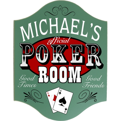 This great Poker Room sign with personalized 5.5" x 24" name board comes ready to hang and is made of real wood with a birch veneer finish. It is highlighted by a 1" poplar wood frame with a routered edge and hand painted gilded pinstripes. Sign measures 18" x 14" and features a keyhole in back for easy hanging. The hand rubbed stain adds a slightly aged look. The personalized Silkscreened text is accented by hand. Our sign is handcrafted and 100% Made in the USA. Made of real wood. Personalize with any name up to 12 characters.